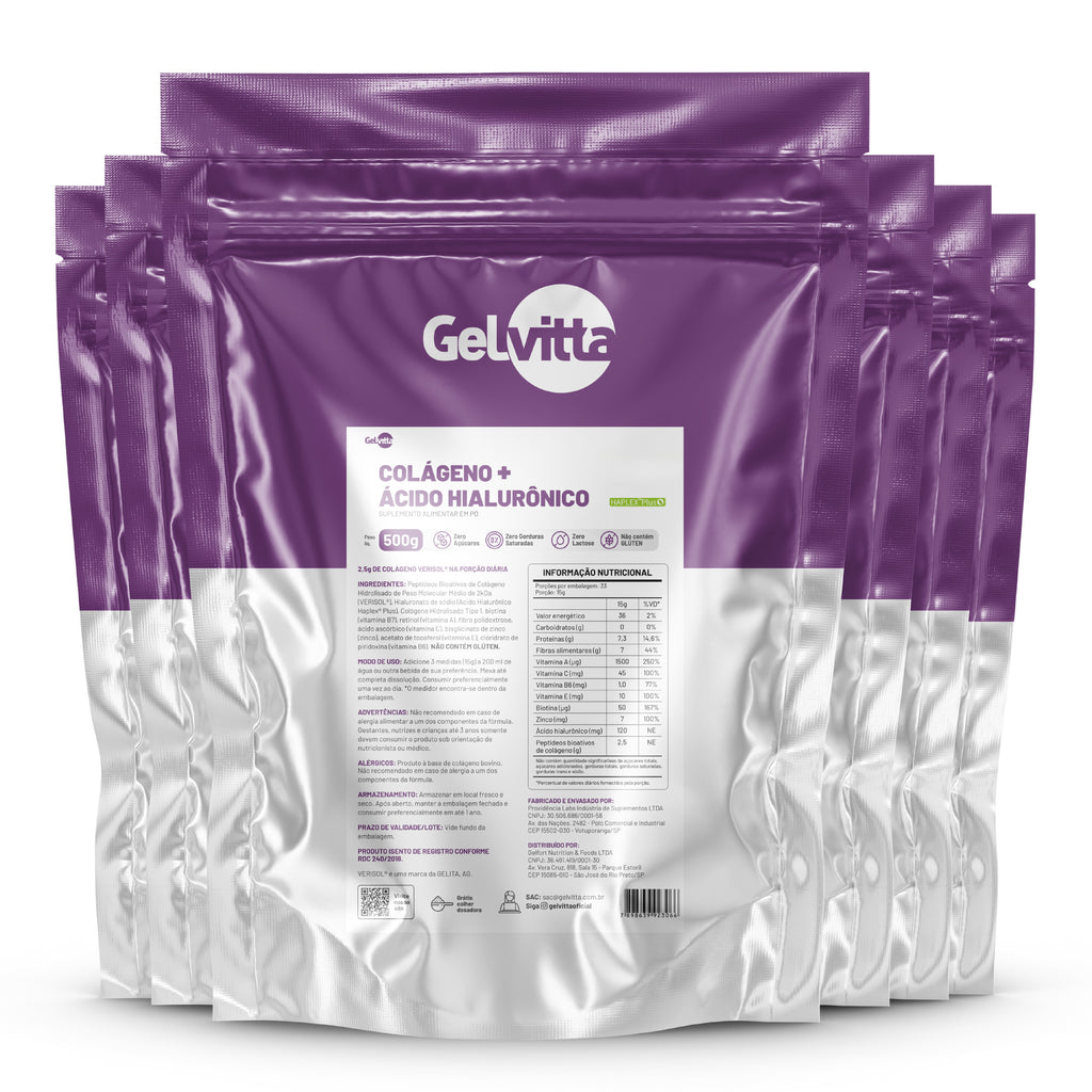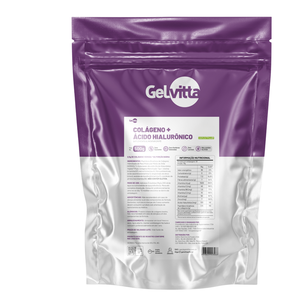 Toda qualidade do colágeno hidrolisado tipo 1 Gelvitta, com Peptídeos Bioativos+ ÁCIDO HIALURÔNICO HAPLEX® PLUS + BIOTINA + Vitamina C. O colágeno é uma proteína que é produzida naturalmente pelo corpo, mas que também pode ser encontrada em alimentos como carne e gelatina, em cremes hidratantes ou suplementos alimentares em cápsulas ou pó. Tem inúmeros benefícios, dentre eles dar firmeza para pele, unhas, cabelos, cartilagem, tendões e das articulações, melhorando a sua saúde e qualidade de vida de quem o consome.